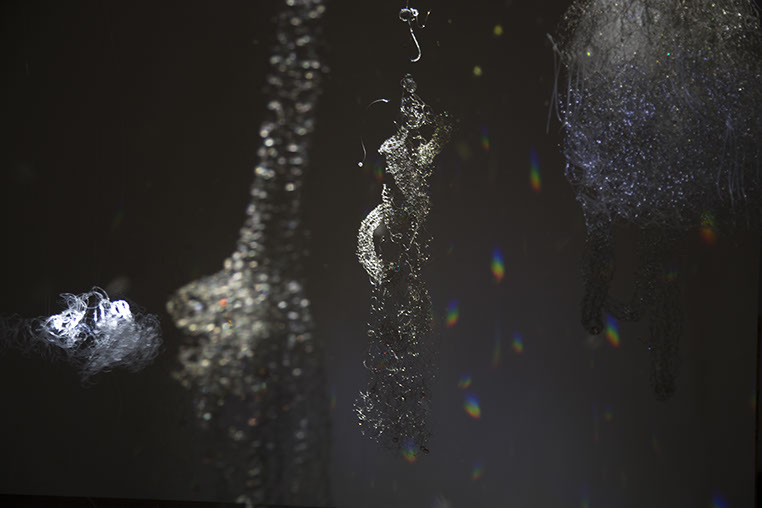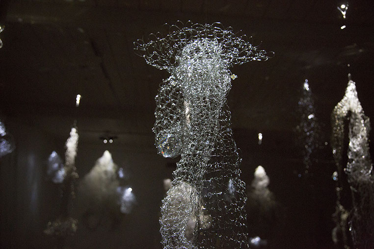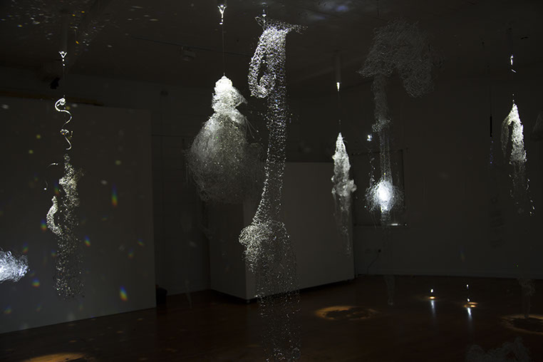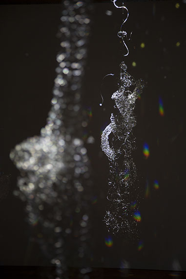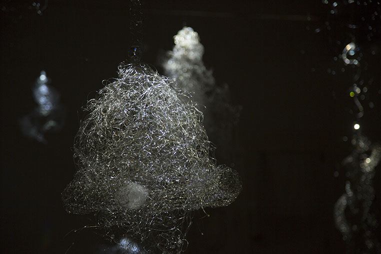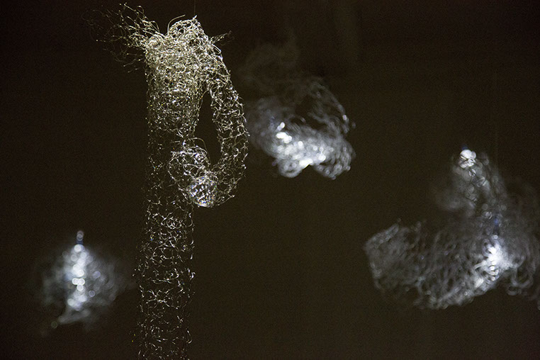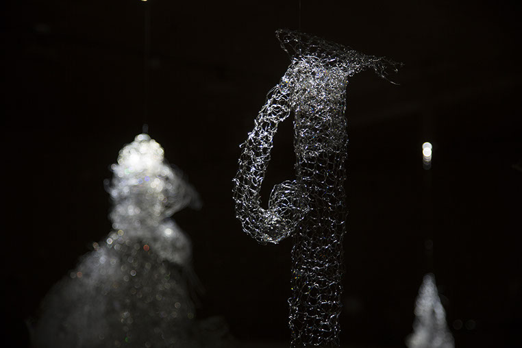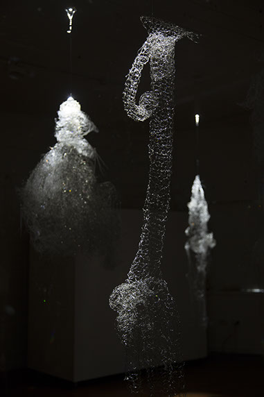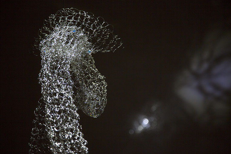 It could also be said that the work embodies attributes of the female world. The installations are hand-built, adapting and aborting traditional craft skills such as knitting and jewellery making, using unconventional materials that include Swarovski crystal, quartz, glass, tarnish-proof silver coated copper wire, stainless steel and Japanese copolymer. My implementation tools range from knitting needles, crochet hooks, fingers, pliers, and fastenings of all kinds, alongside more traditional tools.