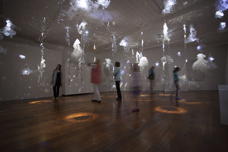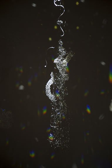 Lucent is an experiential installation that invites viewers to navigate through darkness into light. Transparent sculptural forms float, rotate, and oscillate with the displacement of air, refracting tiny shards of rainbow lights onto surrounding surfaces. Three years in the making, Lucent will engage and mesmerize the viewer offering a brief respite from the external world.