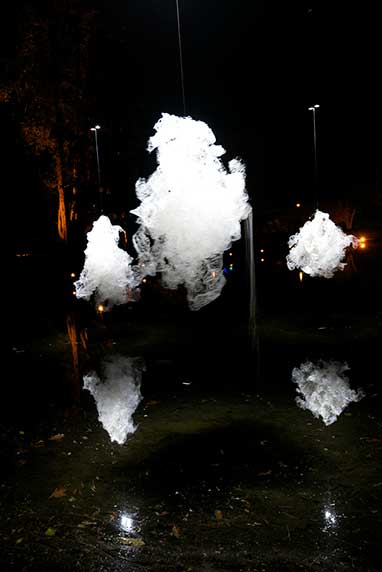 Three kinetic and rotating cloud like forms were suspended above the Pond