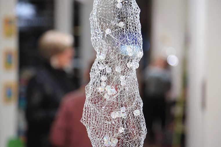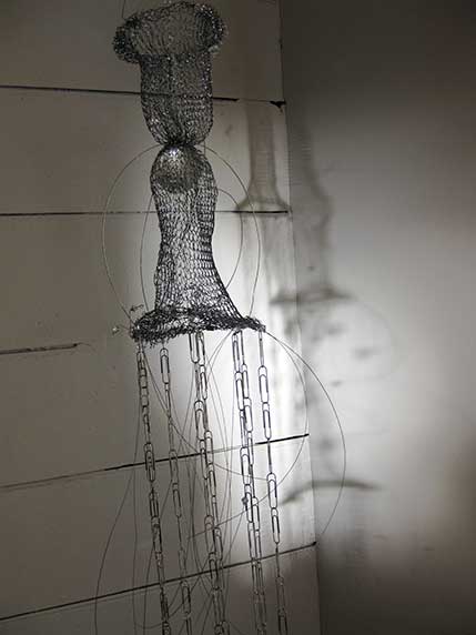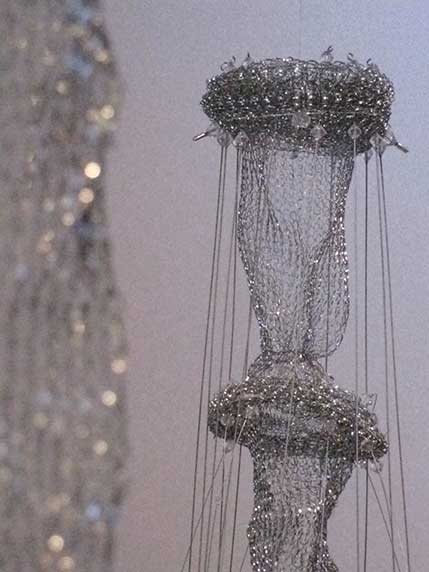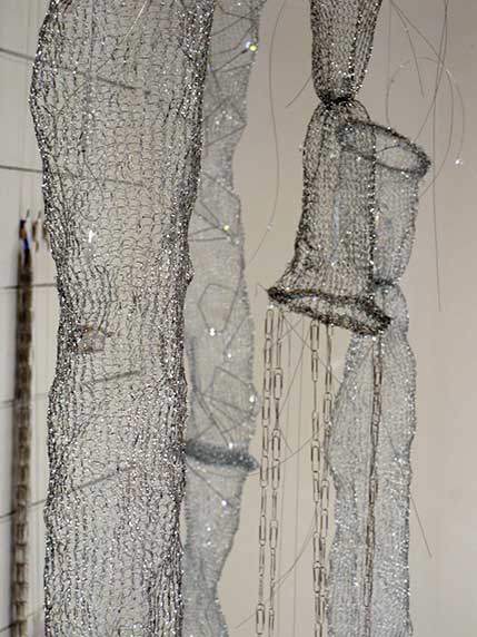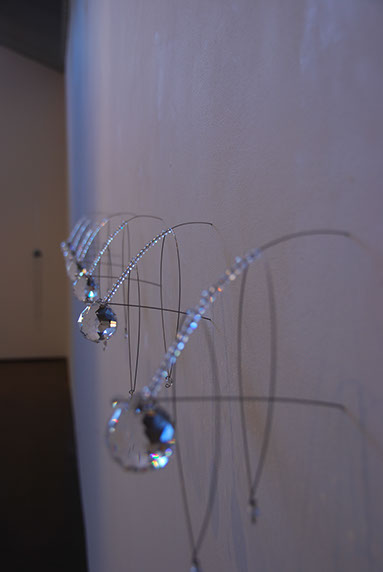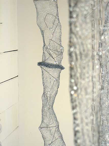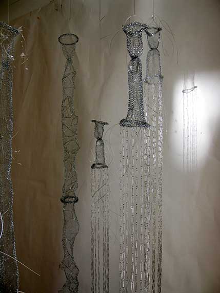 As an artist I have become increasingly interested in ethereal structures that inhabit space, and hover between something and nothing. I have developed this body of work since early 2010 and have used stainless steel, tarnish proof silver coated copper wire, various metal threads, Swarovski crystal, quartz, glass, acrylic, elastic, plastic, Japanese copolymers and found metal objects.