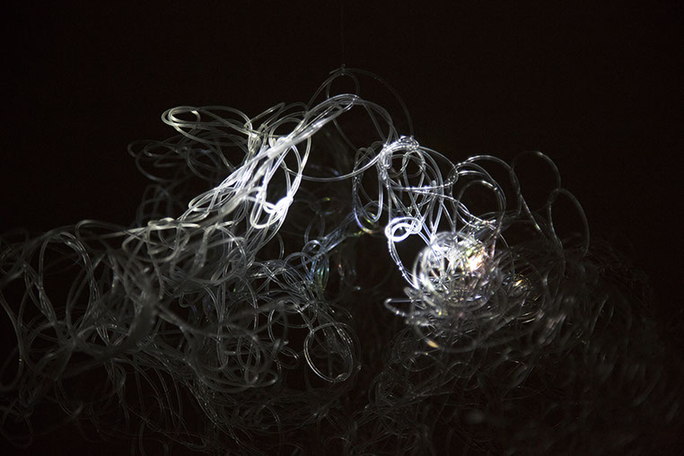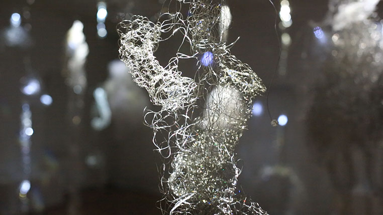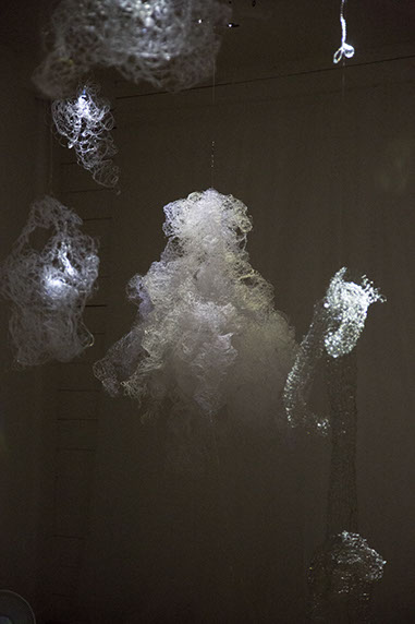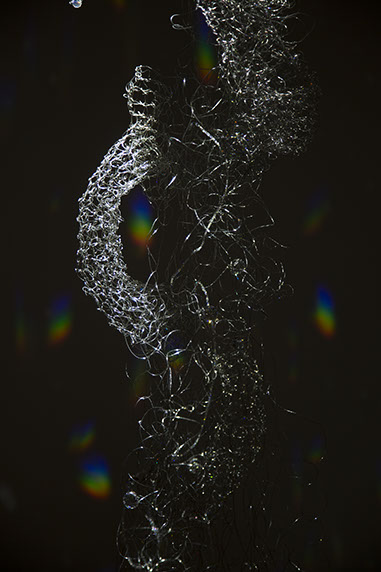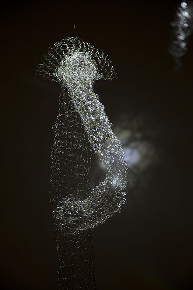 It could also be said that the work embodies attributes of the female world. The installations are hand-built, adapting and aborting traditional craft skills such as knitting and jewellery making, using unconventional materials that include Swarovski crystal, quartz, glass, tarnish-proof silver coated copper wire, stainless steel and Japanese copolymer. My implementation tools range from knitting needles, crochet hooks, fingers, pliers, and fastenings of all kinds, alongside more traditional tools.