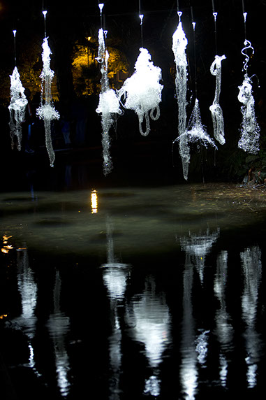 They refracted light from imbedded crystal in sunlight by day, while at night flooded with white led light the pond below acted as a mirror for mysterious reflection and pattern.