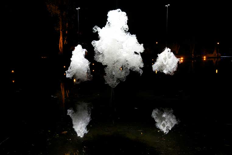 Three kinetic and rotating cloud like forms were suspended above the Pond