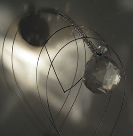 Macrocosm are a series of elongated structures that are hung in groups or clusters. They are created from a variety of materials including: Swarovski crystal, quartz, found metallic objects, silver coated copper wire and stainless steel. The interplay of shadow and light are an important aspect in hanging these small installations. View slide show below.