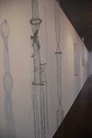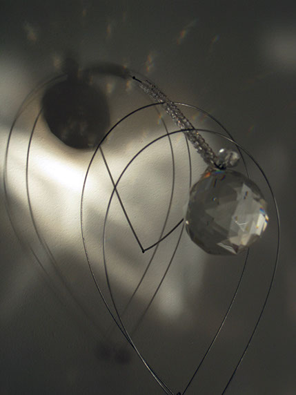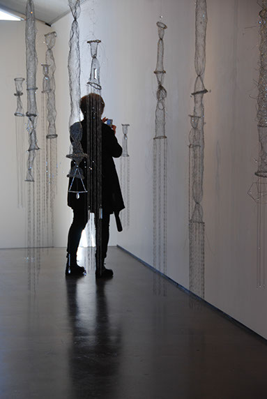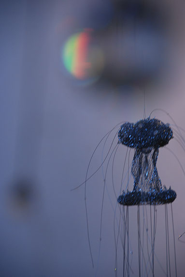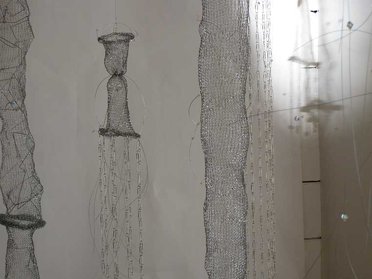 As an artist I have become increasingly interested in ethereal structures that inhabit space, and hover between something and nothing. I have developed this body of work since early 2010 and have used stainless steel, tarnish proof silver coated copper wire, various metal threads, Swarovski crystal, quartz, glass, acrylic, elastic, plastic, Japanese copolymers and found metal objects.